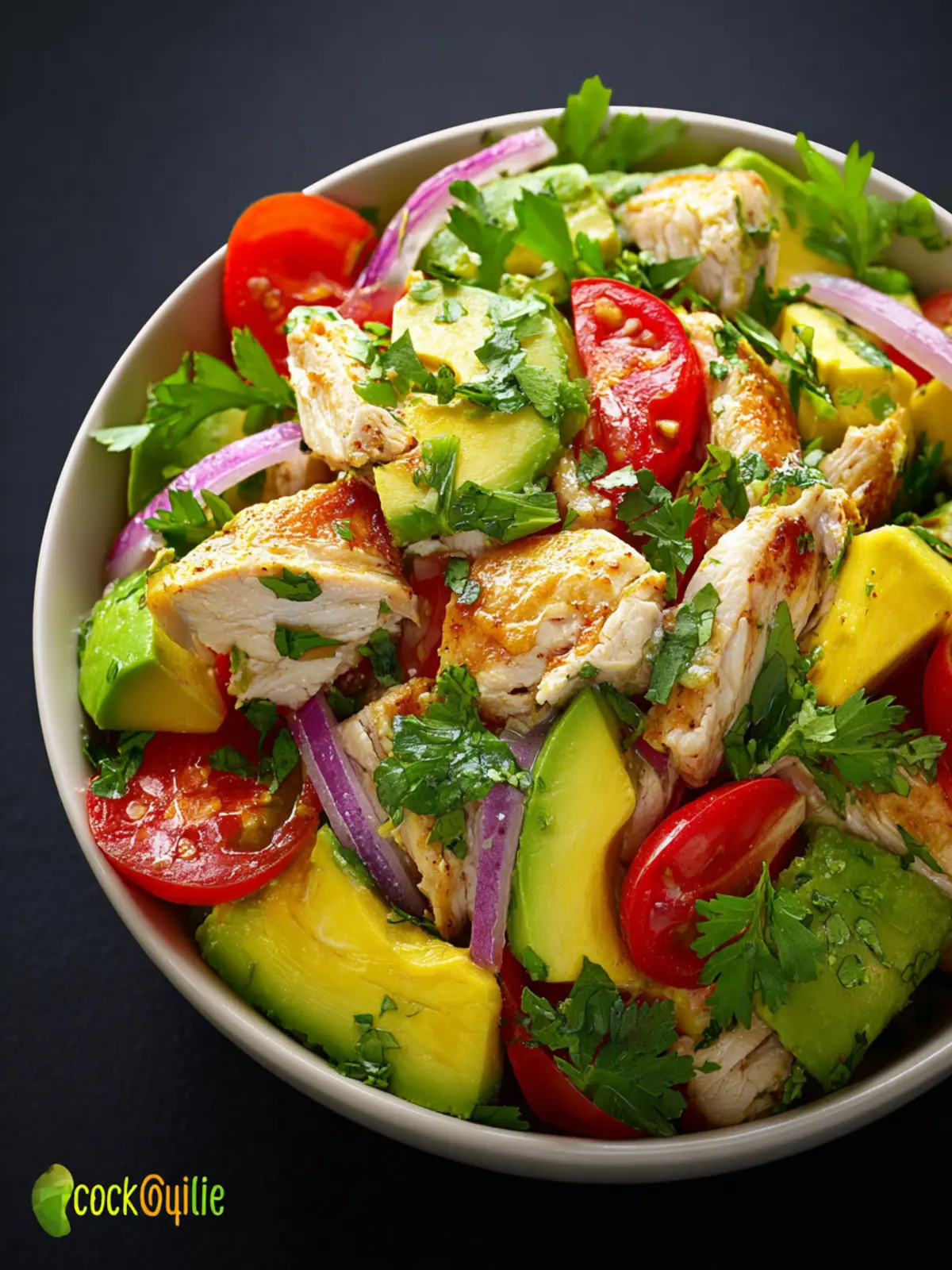 - In a large bowl, combine chicken, avocado, onion, tomatoes, and cilantro.