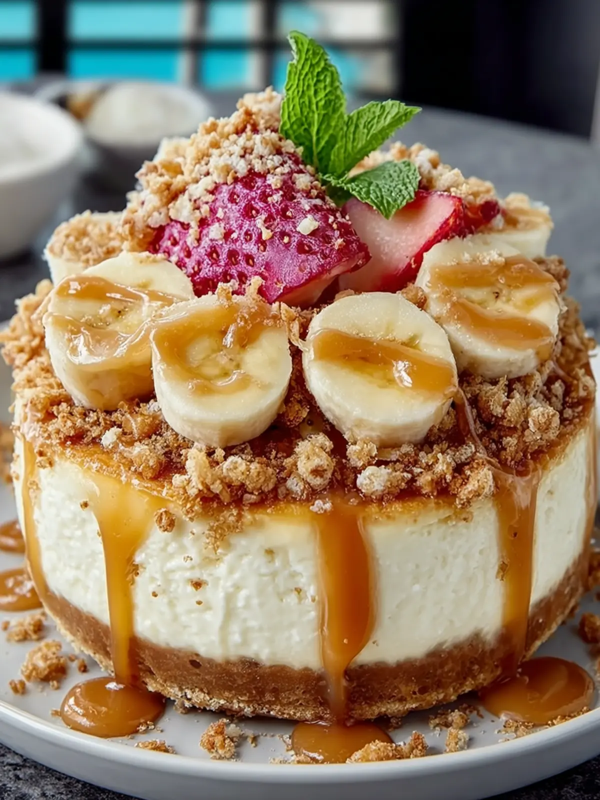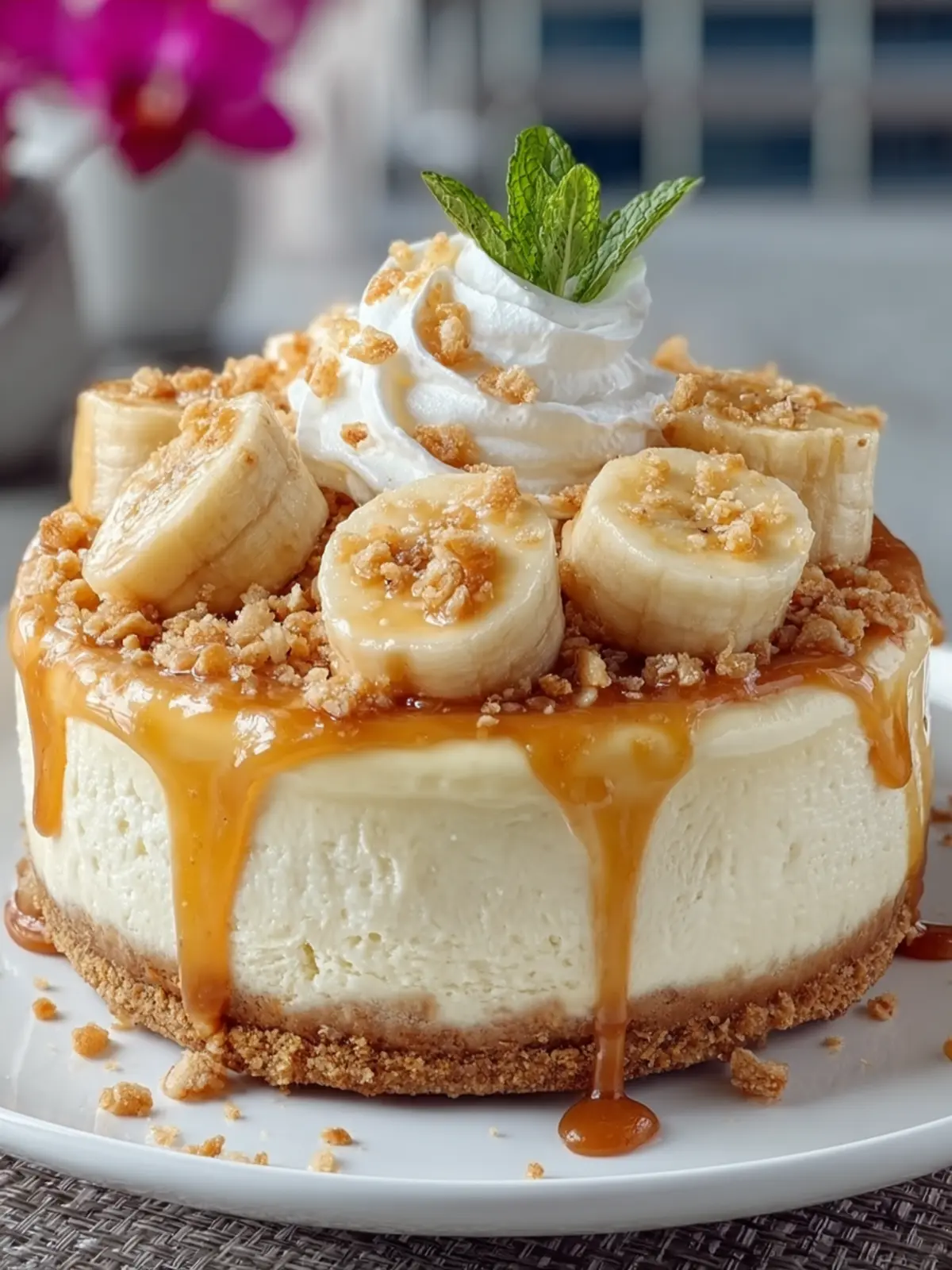 - Sprinkle crunch topping over chilled cheesecake. Optionally, add whipped cream or banana slices before serving.
