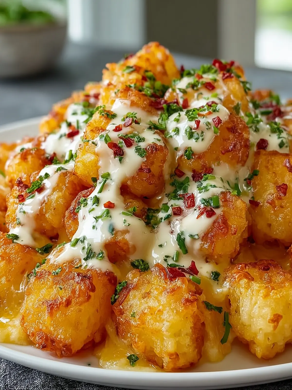 A delicious and easy casserole featuring shredded chicken, ranch dressing, tater tots, and cheese.