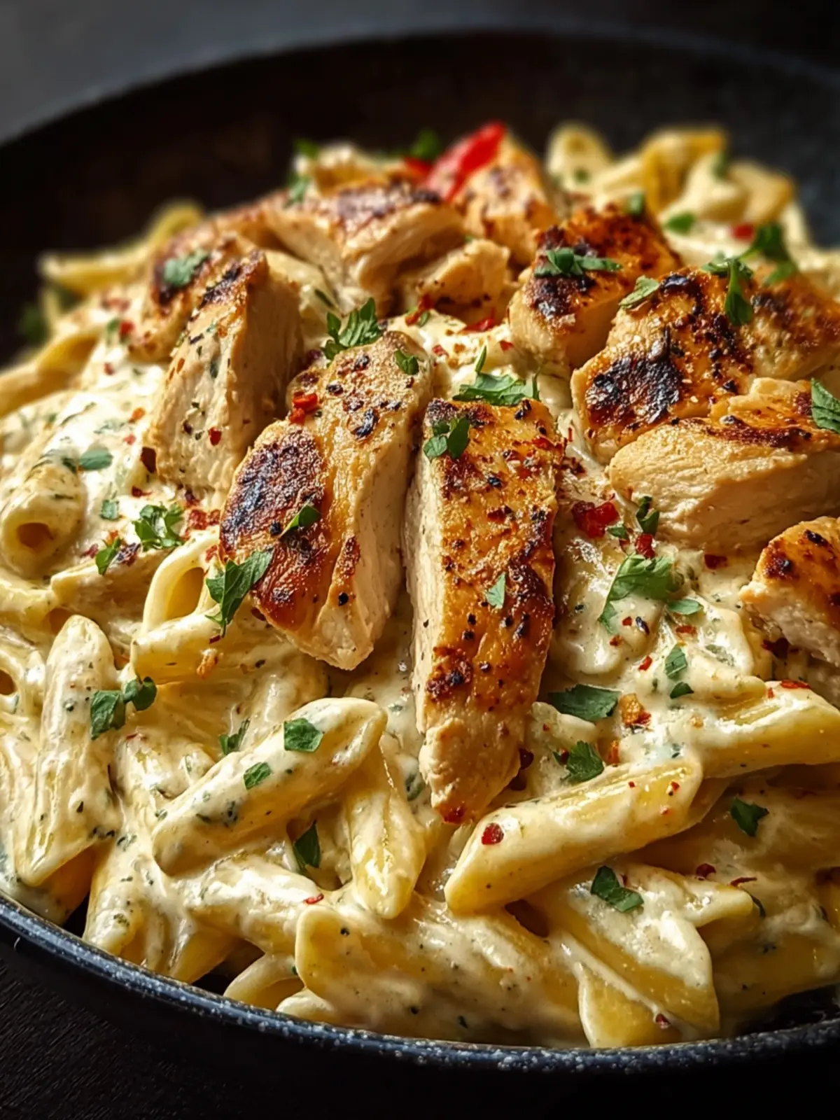 - Return chicken to the skillet, add drained pasta, and toss everything together until well coated. Use reserved pasta water if needed to adjust consistency.