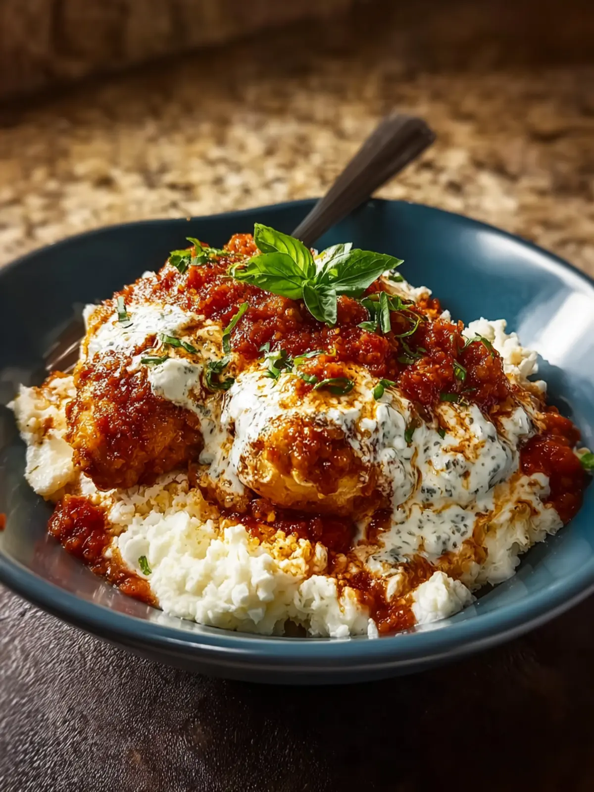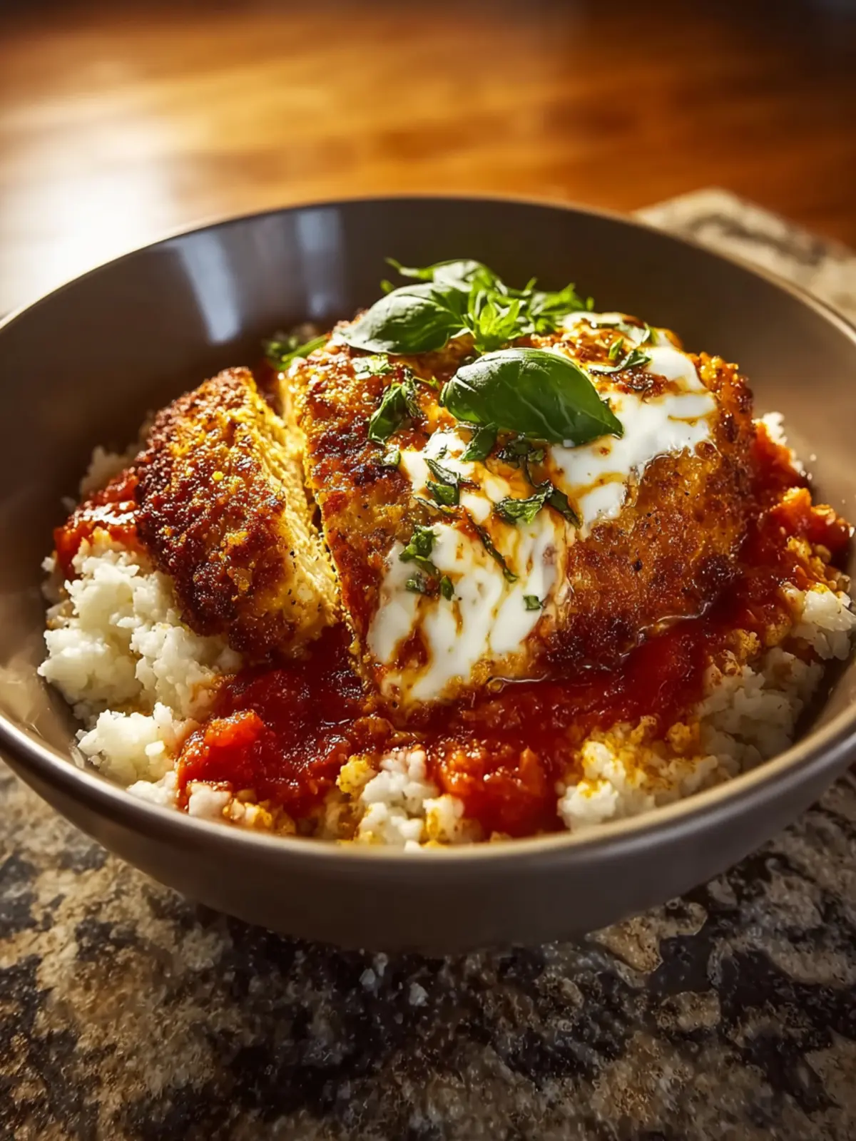 6. Garnish and enjoy with chopped basil or parsley for a pop of color and freshness. Grab a spoon and dig into your cozy cottage cheese chicken parm bowl.