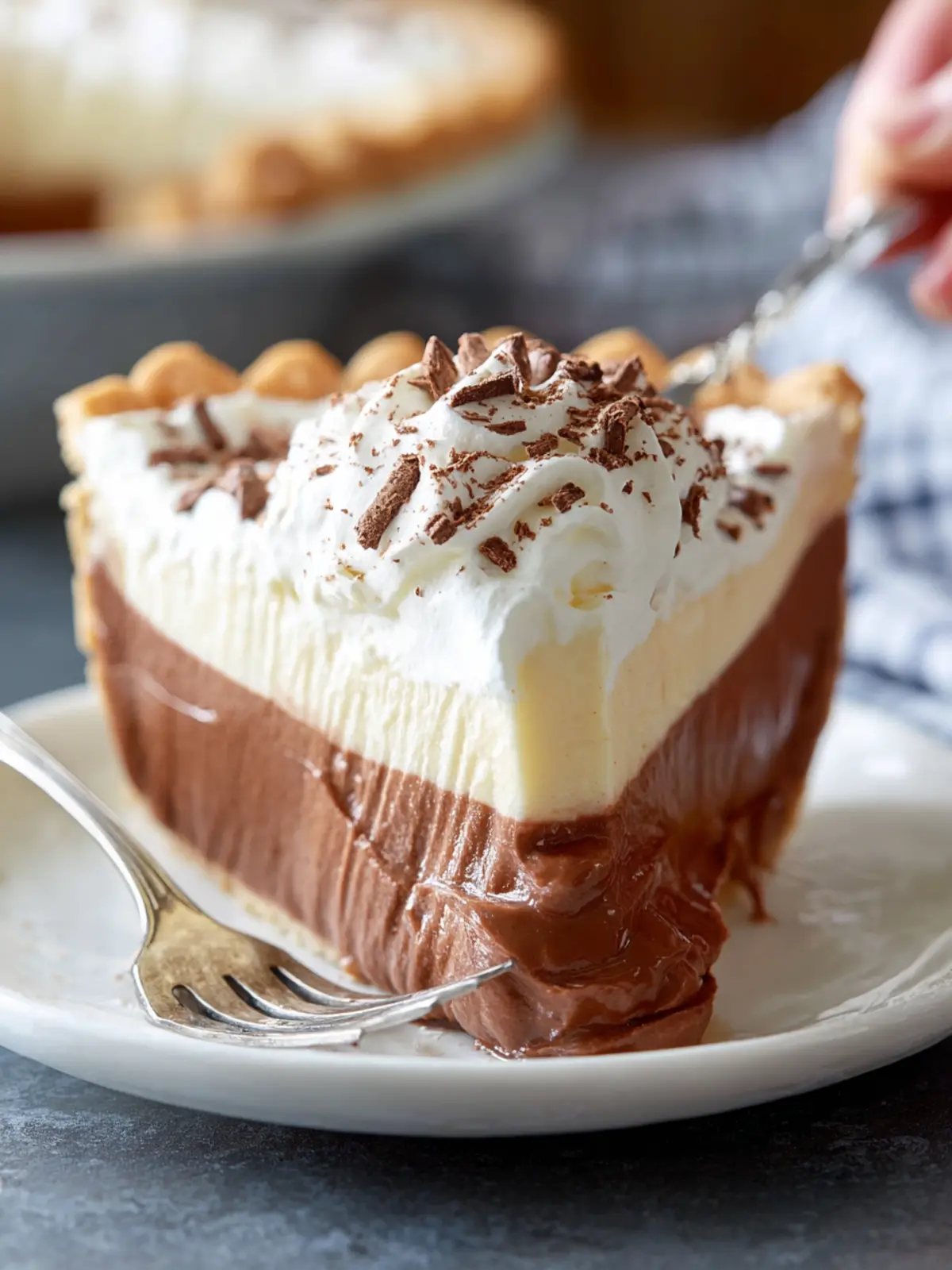 A rich and creamy chocolate pie with a silky texture, topped with whipped cream and chocolate shavings.