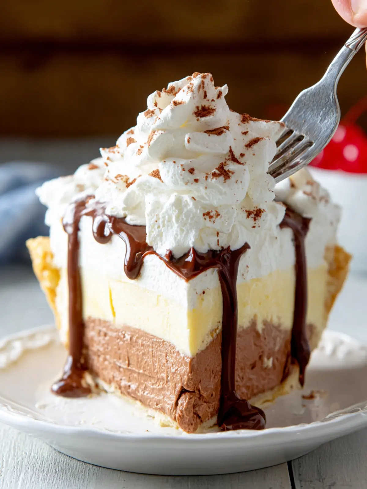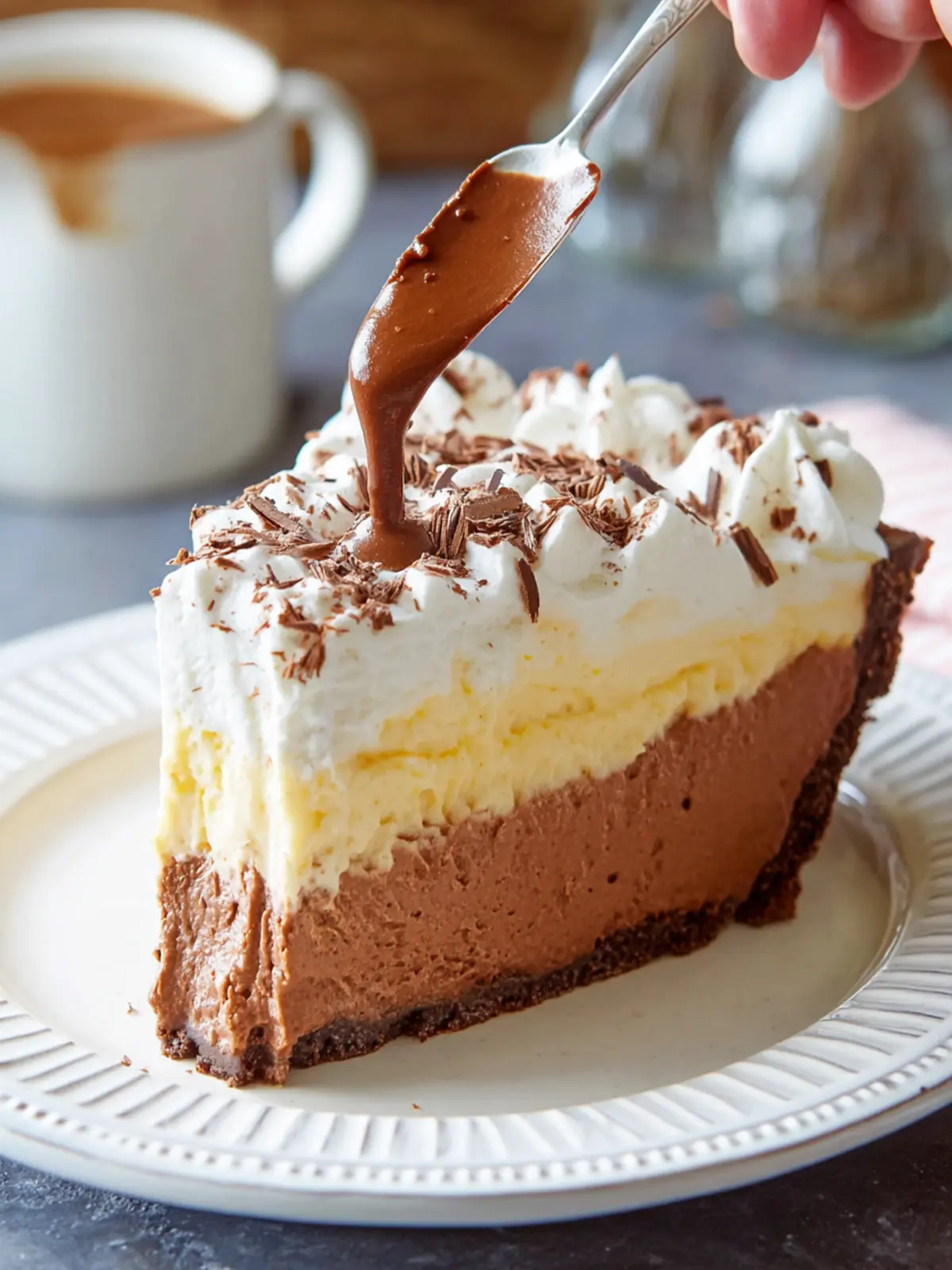 A cup of strong coffee or a creamy latte acts as a perfect palate cleanser and enhances the chocolate flavors. If you’re feeling fancy, serve the pie alongside a glass of dessert wine, like port or a sweet Riesling, which pairs beautifully with chocolate desserts.