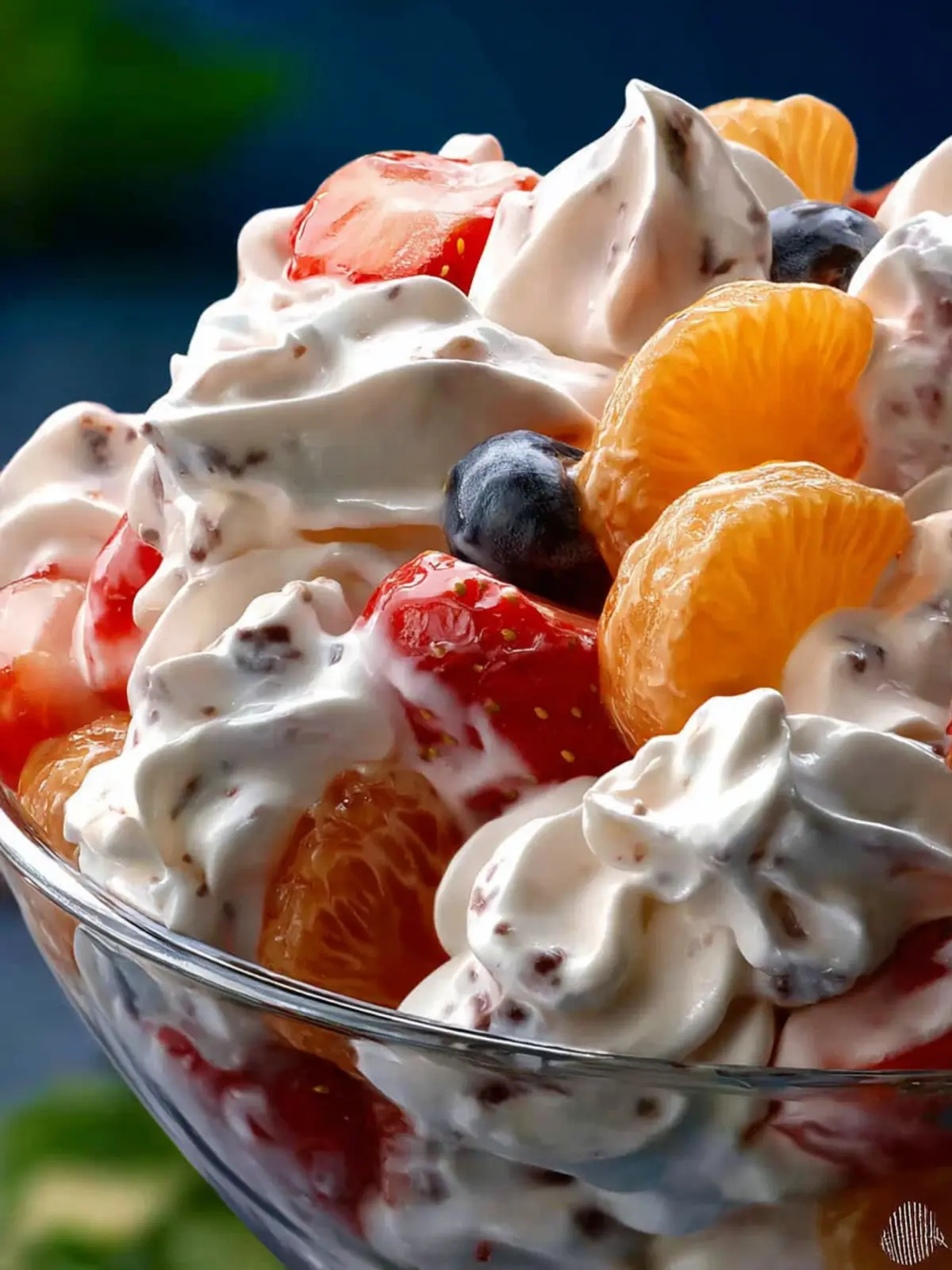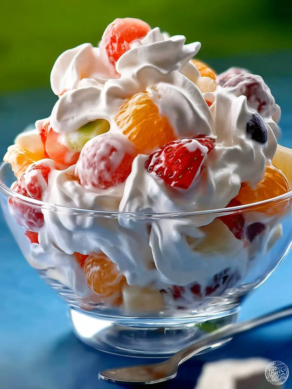 A refreshing fruit salad mixed with whipped topping and sour cream.