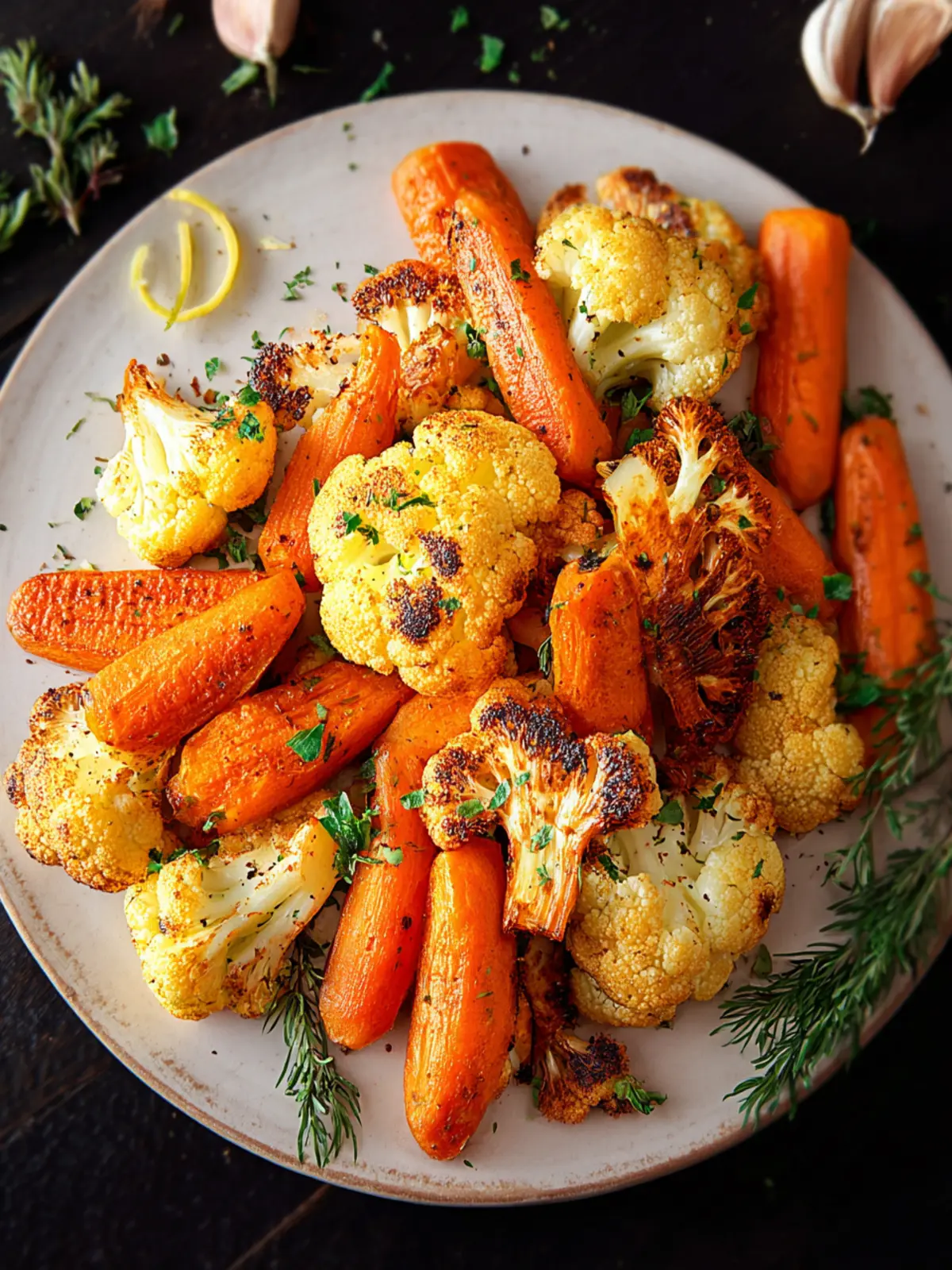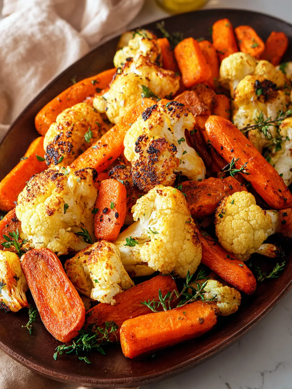 A delicious roasted vegetable side dish featuring cauliflower and carrots, seasoned with herbs and spices.