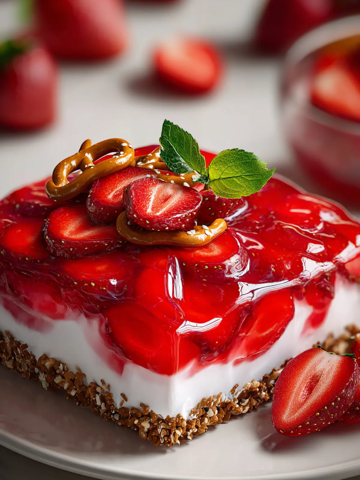 A delicious layered dessert with a crunchy pretzel crust, creamy filling, and fresh strawberries.