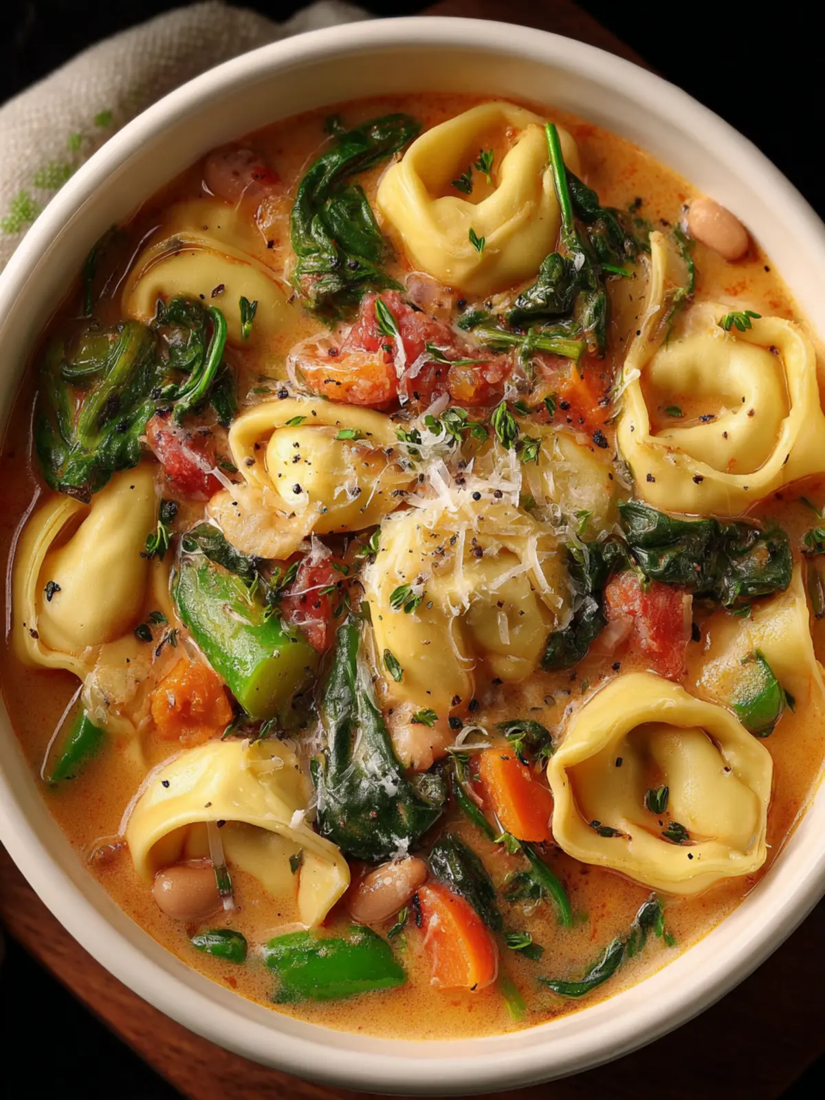 A delicious creamy soup made with tortellini, fresh spinach, and colorful vegetables.